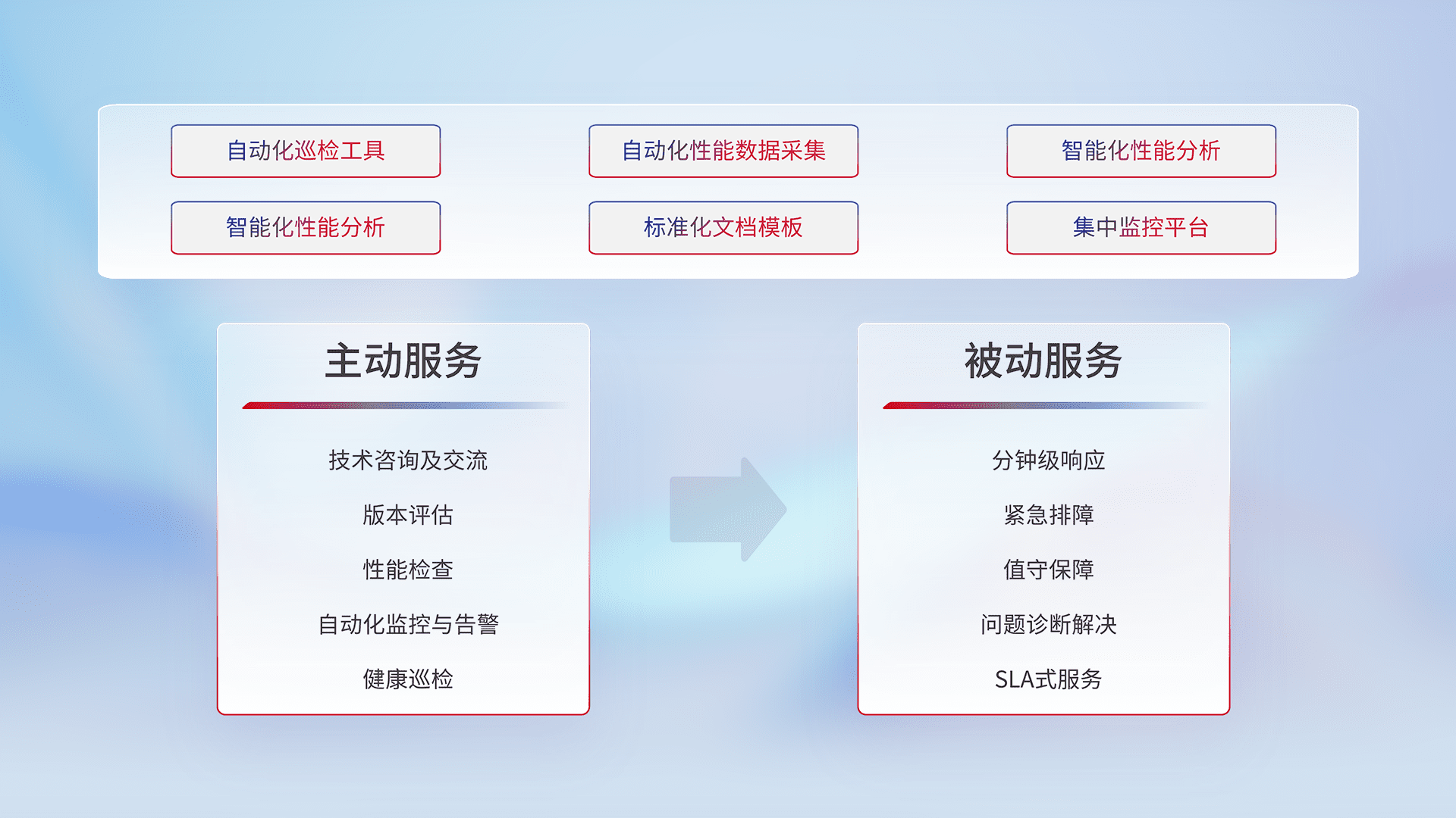 智能化工具和标准化文档,,保障服务质量,,提供主动服务(包含技术咨询、、、、版本评估、、、、性能检查、、自动化监控与告警、、健康巡检)和被动服务包含(分钟级响应、、、紧急排障、、值守保障、、问题诊断解决、、、SLA服务)。。。。