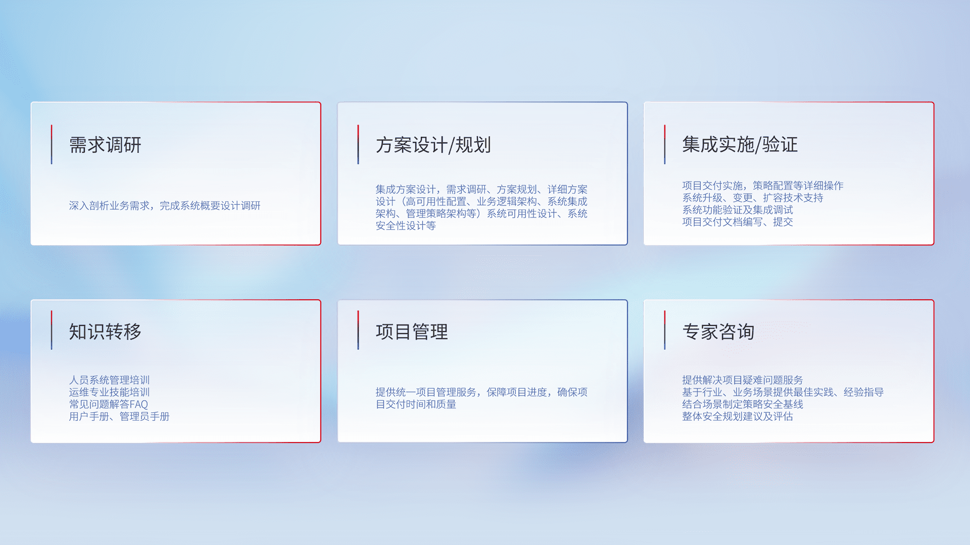 针对客户行业特性,,,,将宏观的安全战略和需求,,,通过专业的交付服务,,,实现项目落地,,为客户提供标准规范的集成交付服务。。